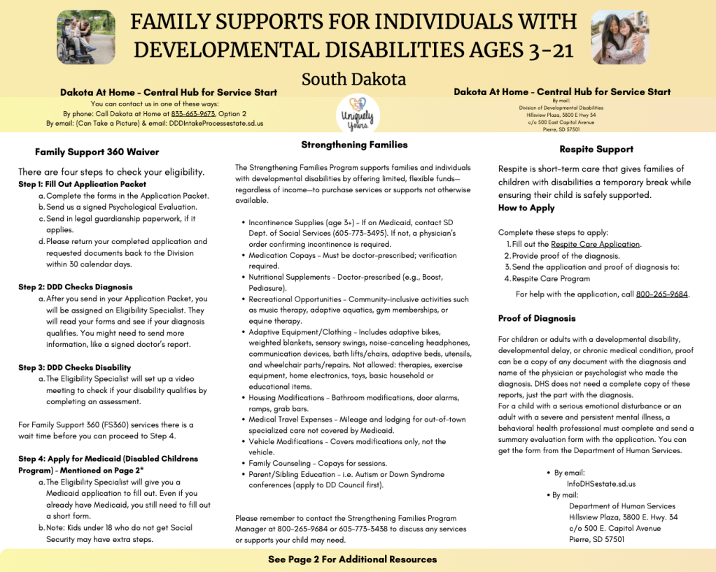 If you’re overwhelmed with trying to find support for your child or young adult with disabilities, this pamphlet outlines where we recommend starting! This info will help set you up for a successful support experience with many resources in the Sioux Falls area.